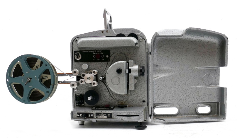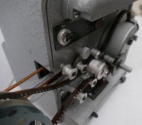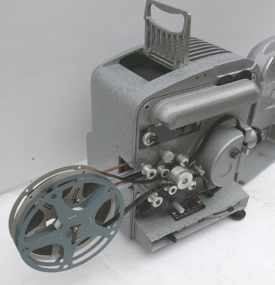 This unusually designed projector has the feed and take-
